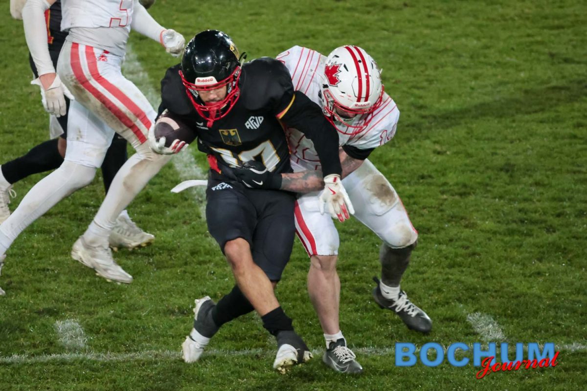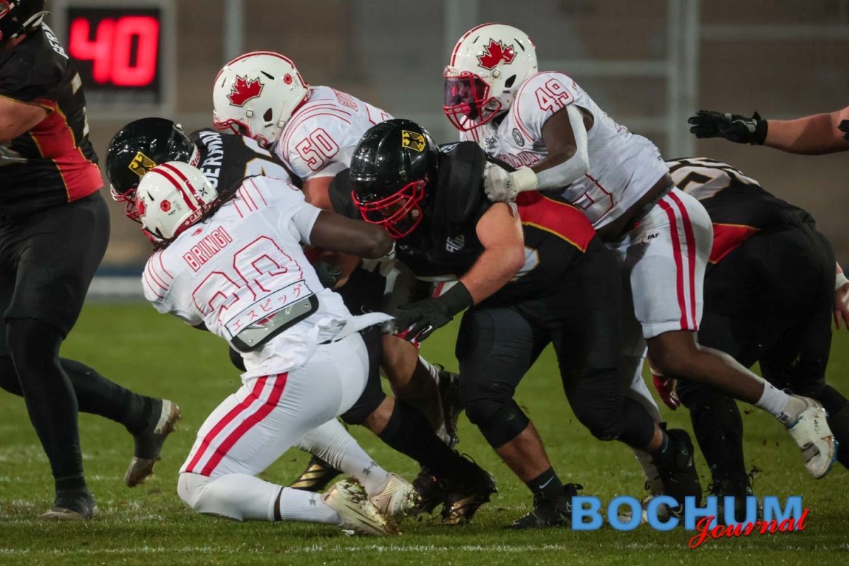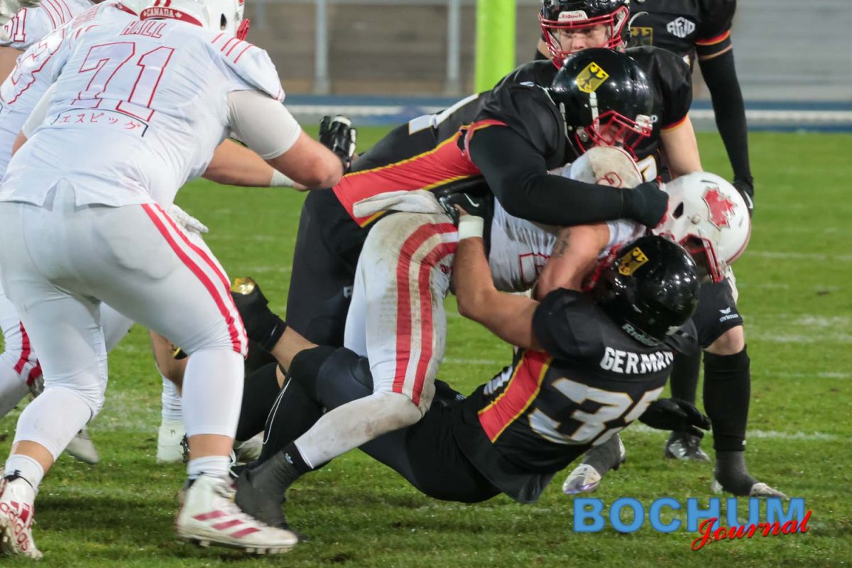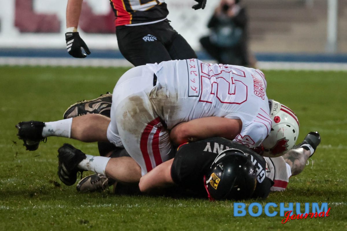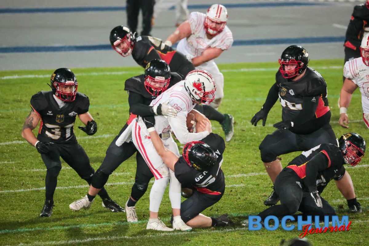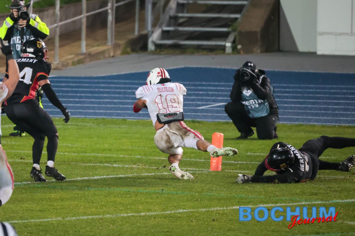 Im Stadion selbst begann Deutschland konzentriert. Nach einer frühen Interception trug Jonas Schultes den Ball zur 7:0-Führung in die Endzone. Die Fans auf der Tribüne reagierten zunächst verhalten, doch die Aktion brachte spürbare Energie in die Partie. Kanada antwortete im zweiten Viertel mit einem Touchdown, ließ aber den Extra-Punkt liegen. Mit 7:6 ging Deutschland in die Pause. Mittlerweile hatte auch der Regen nachgelassen, was das Spiel spürbar flexibler machte, jedoch deutlich den Gästen in die Hände spielte.