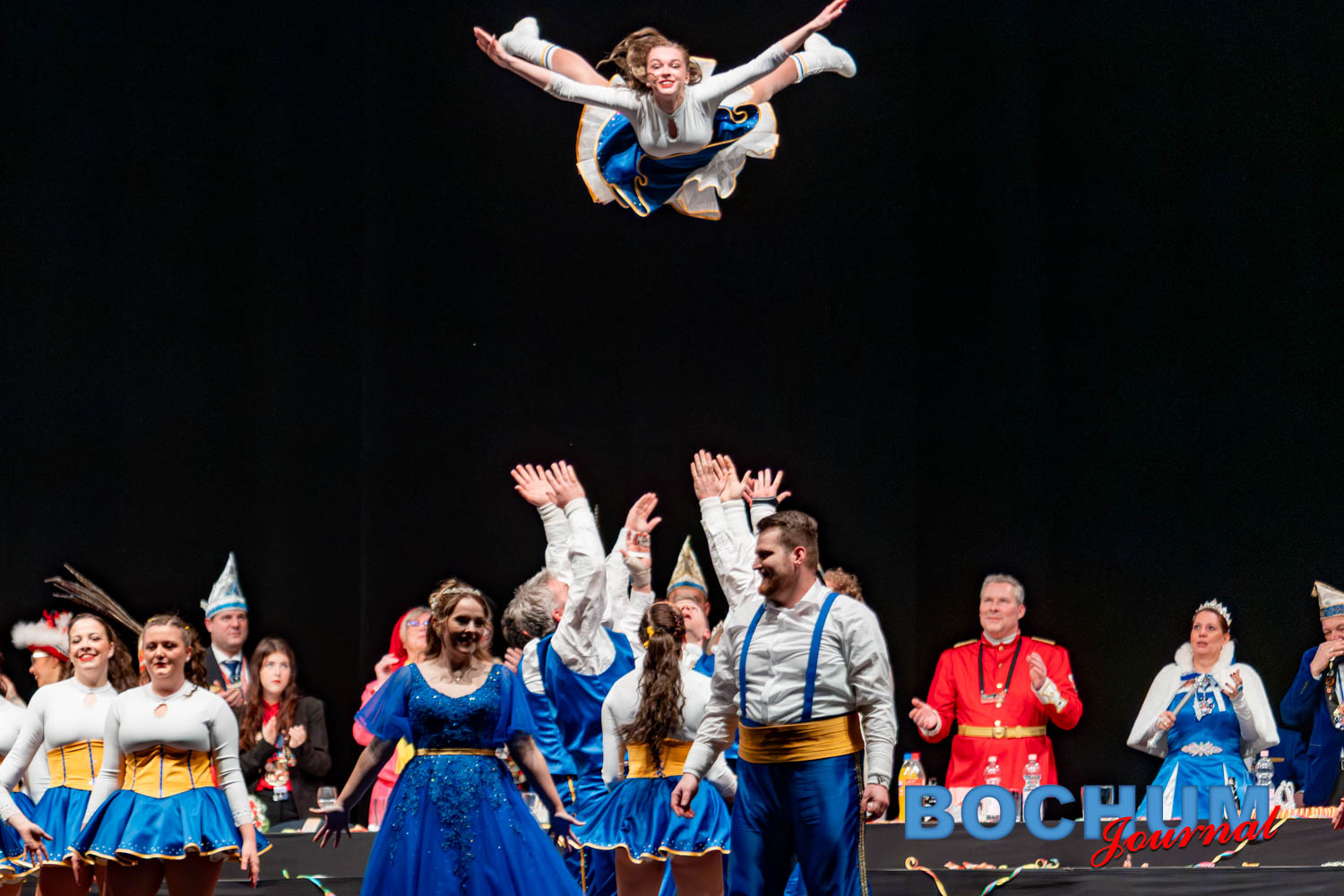 Neben der Stadtgarde hat die Tanzgruppe Klimngenstadt Solingen die Bühne im RuhrCongress zum Beben gebracht. Da haben selbst Prinz Rexy I. (Dominik Rex) und seine Prinzessin Nadine I. (Nadine Sulk) das Tanzbein mitgeschwungen. „Mein Prinz ist hier gleichzeitig auch Tänzer“, sagt Nadine I. über die Doppelbelastung ihres Prinzen. Doch davon hat das Publikum wenig mitbekommen. Stattdessen haben TKS nicht nur die Bühne, sondern auch die Lüfte erobert. Mit Hebefiguren und Würfen hat die Truppe alles gegeben und dafür immer wieder einen kleinen Szenenapplaus bekommen. Mit der Tanzgruppe aus Solingen endet ein mehr als dreistündiges Programm.